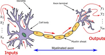 Ein biologisches Neuron hat sehr viele Eingänge (Dendrite) und einen Ausgang (Axon), der aber aufgeteilt und mit vielen Eingängen anderer Neuronen verbunden werden kann (es gibt aber eigentlich nur ein y). Sind die ankommenden Signale von anderen Nervenzellen stark genug, wird ein bestimmter Schwellenwert der Erregung überschritten. Das Neuron sendet dann einen elektrischen Impuls über das Axon entlang in Richtung von Synapsen, die die Schnittstellen zu den nächsten Dendriten sind und meistens den elektrischen Impuls chemisch weitergeben.